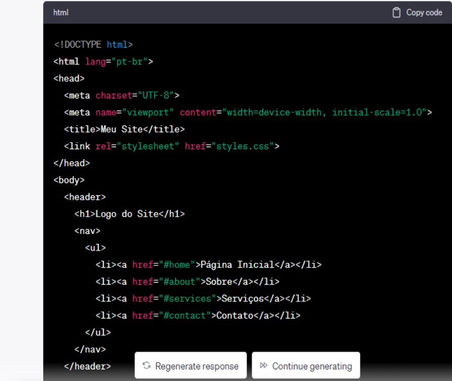 Seguindo a orientação do ChatGPT para site, digite: “Crie uma estrutura básica para site em html”. A plataforma fornecerá uma estrutura básica com cabeçalho, página principal e rodapé, permitindo que você copie o código.
