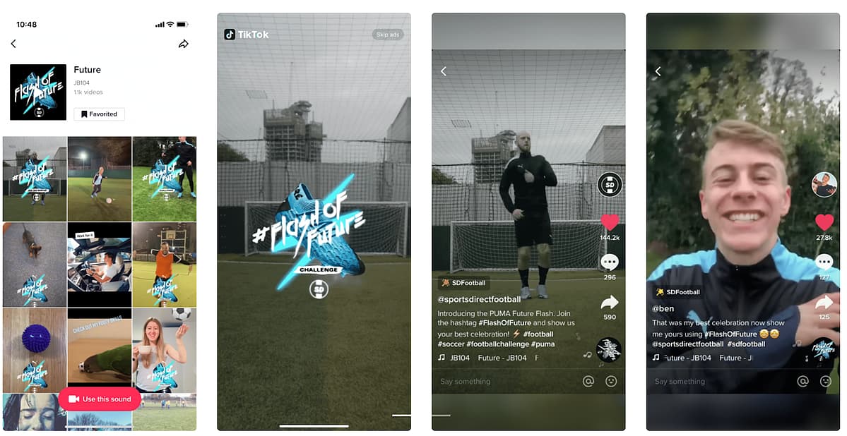 A marca esportiva Puma usou o Branded Effects para promover um novo modelo de chuteiras. O adesivo 3D da marca convidava os usuários para um jogo de realidade virtual com uma bola de futebol. Eles combinaram o adesivo do Branded Effects com um desafio de hashtag que culminou em mais de 100.000 vídeos de conteúdos gerados por usuários.