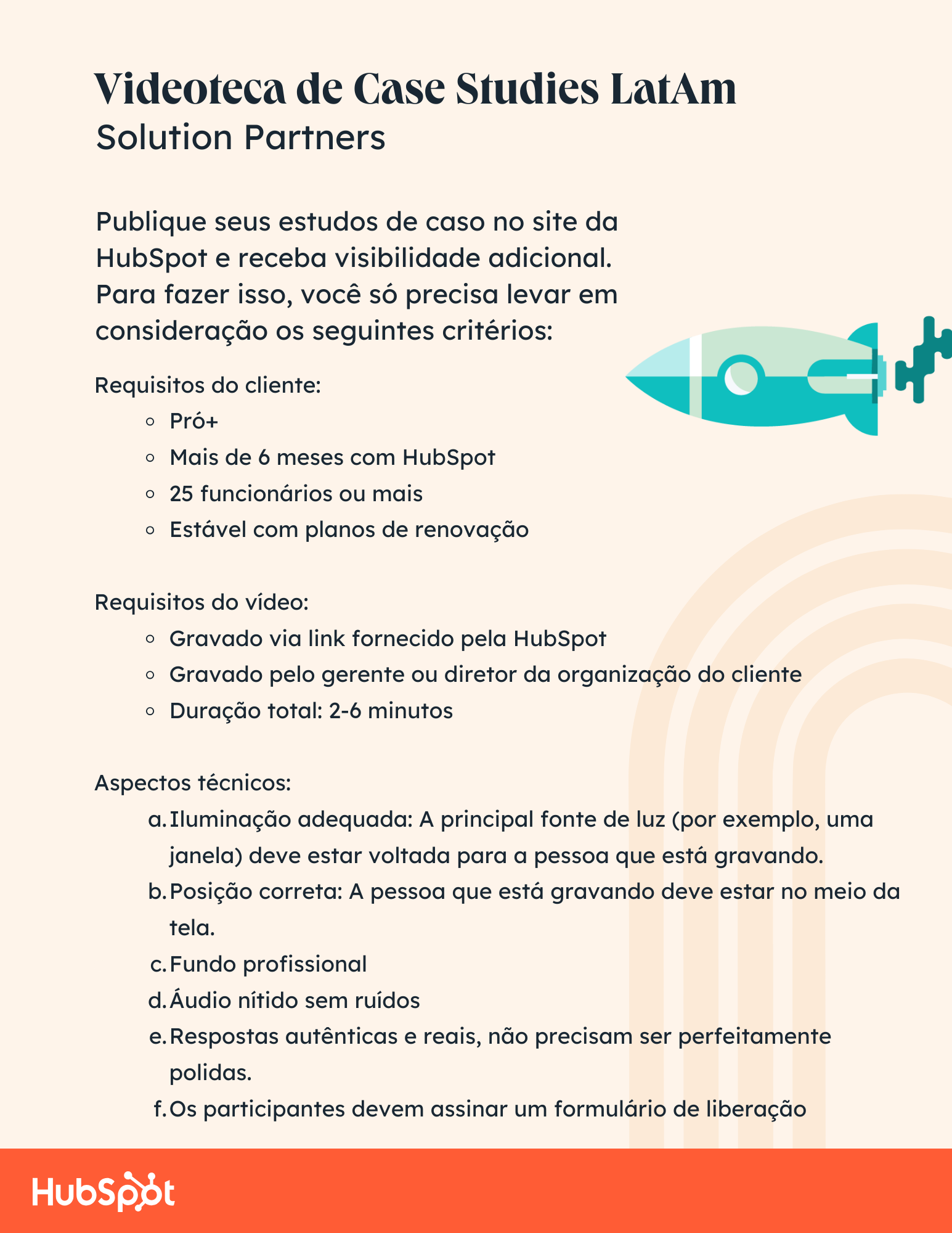 O programa Videoteca de Estudos de Caso de Parceiros HubSpot (em sua versão Beta) oferece aos Solution Partners a oportunidade de compartilhar histórias de sucesso de seus clientes. Por meio de uma experiência web, os clientes dos Solution Partners poderão enviar vídeos que apresentam as conquistas alcançadas graças à implementação da HubSpot e à participação dos seus Solution Partners no processo.
