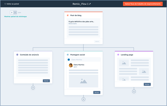 Os modelos oferecem sequências de produção de conteúdo que são comumente usadas para objetivos de marketing, como conteúdo para geração de leads ou ativos de reconhecimento de marca. Depois de selecionar se você está reaproveitando manualmente ou criando a partir de um modelo, você pode inserir seu conteúdo original.
